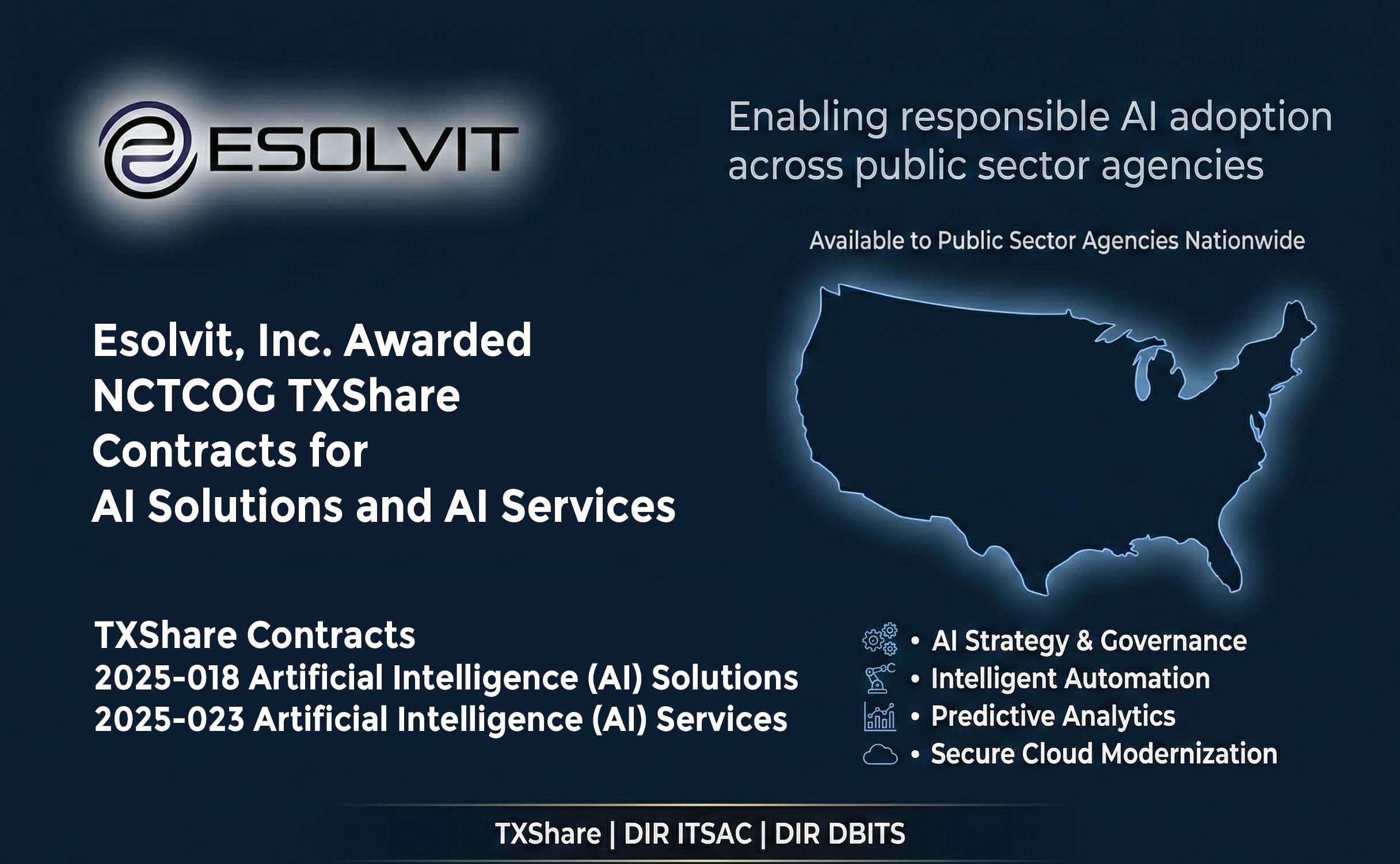 Esolvit, Inc. a proven leader in delivering innovative Artificial Intelligence (AI) solutions with over 60 years of collective technical project management experience and a 100% successful project delivery track record, is pleased to announce that it has been awarded a Master Services Agreement (MSA) with the North Central Texas Council of Governments (NCTCOG) under its TXShare Cooperative Purchasing Program. Leveraging deep expertise in AI/ML technologies, real-time analytics and scalable software solutions for both public sector and commercial enterprise applications, Esolvit is uniquely positioned to help governmental entities harness AI to improve efficiency, enhance decision-making and drive innovation.